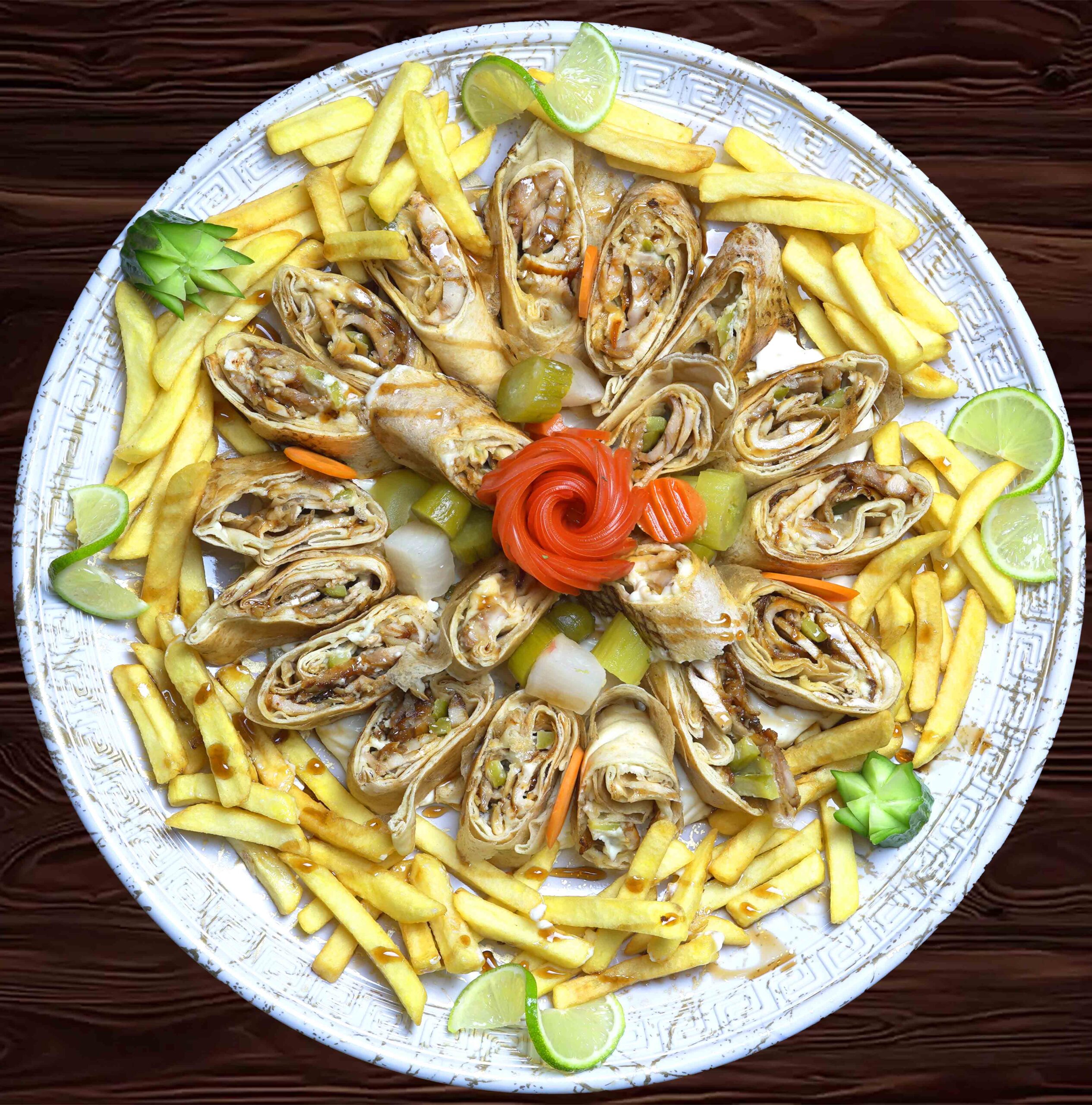 5 Schawarma-Sandwiches serviert mit Pommes, Knoblauchsoße und eingelegtem Gemüse